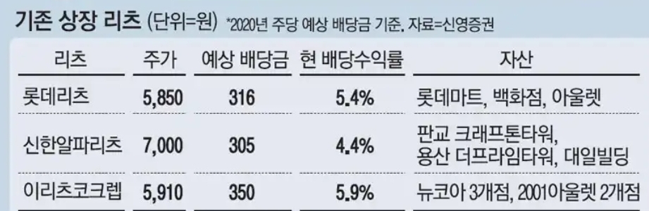 1일 주가 기준으로 2020년 예상 주당 배당금을 감안한 배당수익률은 이리츠코크렙 5.9%, 롯데리츠 5.4%, 신한알파리츠 4.4%다.