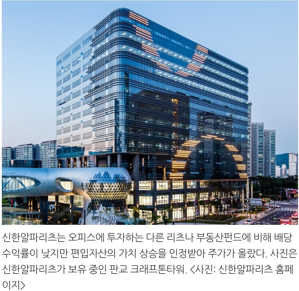 신한알파리츠는 오피스에 투자하는 다른 리츠나 부동산펀드에 비해 배당수익률이 낮지만 편입자산의 가치 상승을 인정받아 주가가 올랐다. 사진은 신한알파리츠가 보유 중인 판교 크래프톤타워. <사진: 신한알파리츠 홈페이지>