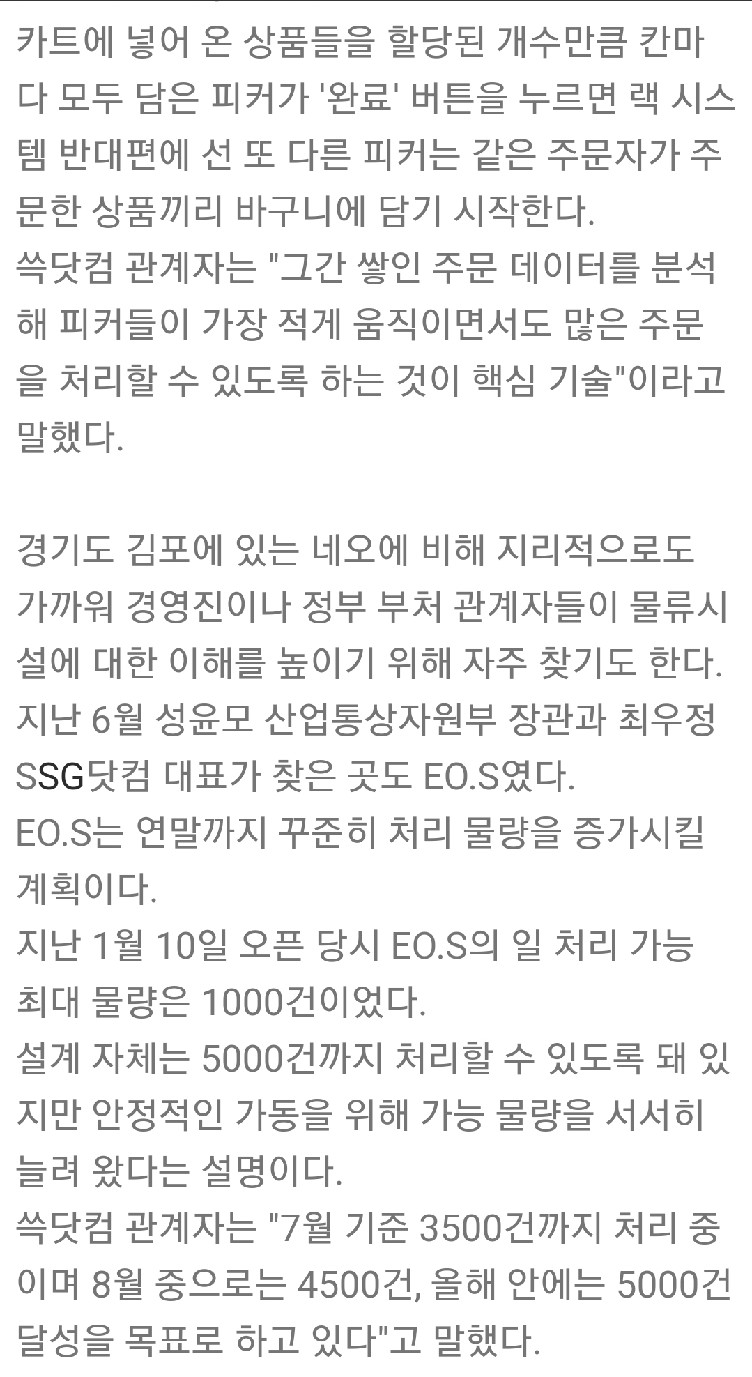 이마트와 SSG닷컴을 운영하는 신세계는 용인과 김포에서 온라인 전용 물류센터인 네오(NE.O)를 운영 중으로, 올 연말에는 김포에 세 번째 센터를 열 계획이다. 세 곳이 동시에 가동하면 하루 8만건 가량의 고객 주문을 처리할 수 있을 것으로 예상된다. 신세계는 2020년까지 서울을 포함한 수도권 지역에 NE.O를 6곳 개설, 전 지역 당일 배송 체계를 구축하겠다고 밝혔다.