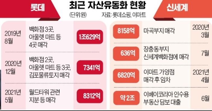 롯데, 신세계 경영진이 ‘유통업은 부동산이다’는 인식에서 벗어나 공격적인 투자를 적극 모색하는 것도 큰 변화다. 신 회장은 2008년 “부동산으로 돈 버는 시대는 지났다”고 선언했지만 롯데쇼핑이 자산 유동화에 본격 나선 건 2019년 롯데리츠를 설립하면서부터다. 대형 기관투자가 관계자는 “최근 글로벌 큰손들은 기업들이 부동산 등 자산이 아니라 본원적인 경쟁력으로 승부하길 원한다”며 “삼성, SK그룹 등이 일찌감치 본사 건물을 매각한 것도 이런 이유에서”라고 설명했다.