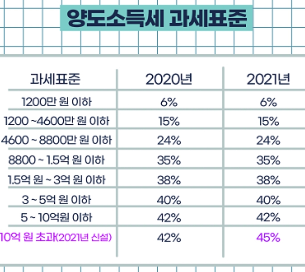 즉, 양도소득세는 차익에 대해 매기는 겁니다. 12억원짜리 집을 15억원에 팔았다면 ,3억원에 대해 내는 겁니다. 세율은 액수에 따라 6~45%입니다.