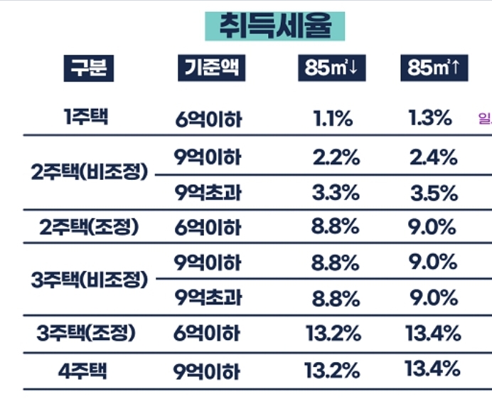 2주택자부터는 취득세가 가파르게 오르는데요. 조정지역과 비조정지역이 다른데, 지금 대다수 지역이 조정지역에 편입되어 있으므로 조정지역을 기준으로 말씀드리겠습니다. 개인이 조정지역에서 2주택을 매수할 때는 85㎡ 이상은 9%(85㎡ 이하는 8.8%), 3주택 매수할 때는 13.4%(85㎡ 이하는 13.2%)가 적용됩니다. 참고로 조정지역에 해당하느냐 아니냐는 원래 기존에 가지고 있던 주택이 아니라 새로 취득하는 주택이 기준입니다.