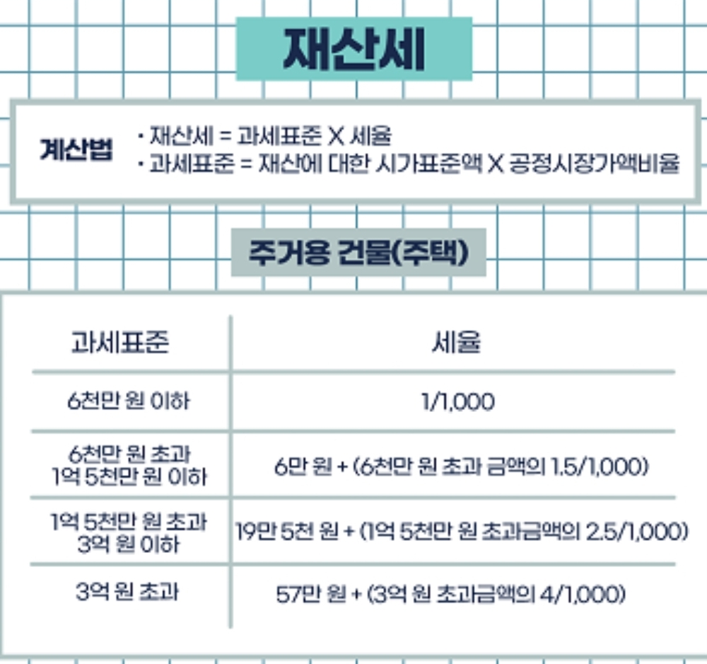 재산세를 계산하는 방식은 공시가격에 공정시가액비율(60%)을 구해 먼저 과세표준을 구합니다. 이 과세표준에 따라 6000만원 이하는 0.1%, 1억5000만원 이하는 0.15%, 3억원 이하 0.25%, 3억원 초과는 0.40%인데요. 이 세율을 과세표준에 곱하면 최종 재산세가 됩니다. 다만, 도시지역인 경우 0.14%가 추가적으로 부과됩니다.
