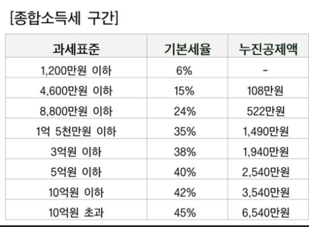 ㅡ첫째, 소득에 대한 적용 세율이 낮다. 일반적으로 ㆍ개인은 최저세율 6%에서 최고세율 45%까지 초과 누진세율을 적용받는다. 1200만원 이하는 6%, 4600만원 이하 구간은 15%, 8800만원 이하 구간은 24%, 1억 5000만원 이하 구간은 35%, 3억원 이하 구간은 38%, 5억원 이하 구간은 38%, 10억원 이하 구간은 42%, 10억원 초과 구간은 45%이다.
