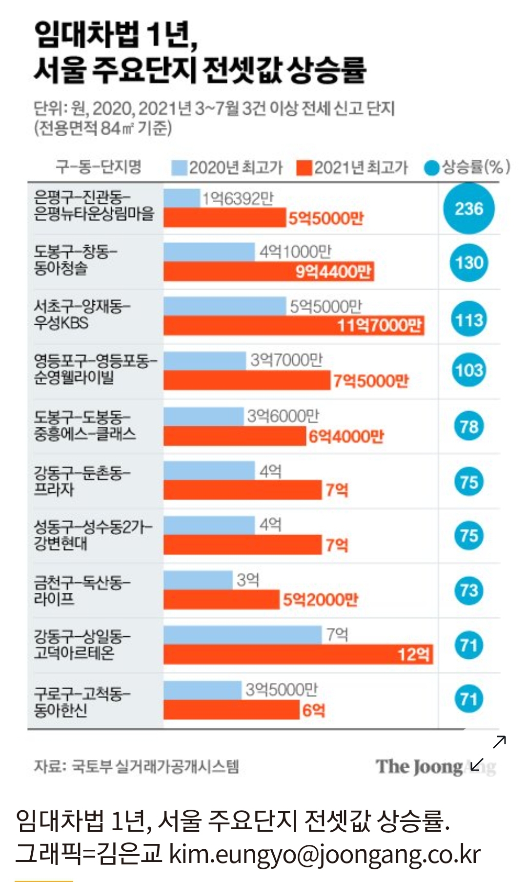 중앙일보가 1일 서울지역 아파트 1116개 단지를 조사해보니, 지난 1년간 전셋값이 두배(100%) 이상 뛴 단지가 4곳이나 됐다. 전셋값이 50% 이상 오른 단지는 전체의 7.8%(87곳)였으며, 청원인의 주장처럼 전셋값이 2억5000만원 이상 뛴 단지도 12.3%인 137곳으로 나타났다. 국토부 실거래가 공개시스템에 등록된 지난해 7월 말 임대차법 시행 전 5개월과 올해 최근 5개월 동안 전세 거래가 각각 3건 이상(전용면적 84㎡ 기준)인 아파트 단지 1116곳의 전세보증금 최고가를 비교한 결과다.