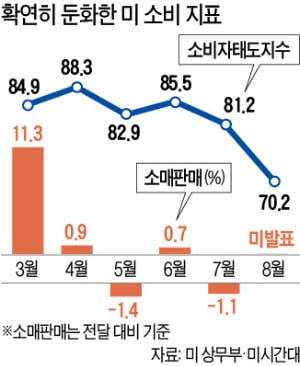 지난달엔 그동안 불티나게 팔리던 자동차와 의류 판매마저 주춤한 것으로 나타났다. 차량 및 부품 판매는 전달 대비 3.9%, 의류는 2.6% 각각 감소했다. 미국에서 소비는 국내총생산(GDP)의 70%를 차지하기 때문에 경기를 판단하는 대표 지표로 활용된다. 미시간대가 공개한 소비자태도지수 역시 급격히 식은 것으로 집계됐다. 이달 예비치가 70.2로, 2011년 12월 이후 최저치를 기록했다. 팬데믹(대유행) 직후였던 작년 4월(71.8)은 물론 시장 예상(81.3)을 크게 밑돌았다. 태도지수는 미 소비자의 현재 경제 상황에 대한 신뢰도를 보여주는 숫자다.