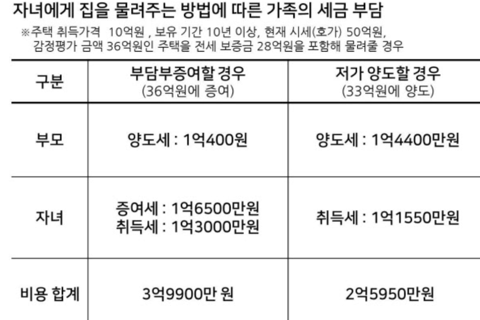 유 세무사는 “자녀에게 고가 주택을 물려 주는 방식은 여러가지가 있는데, 자녀의 세부담 능력과 부모의 부동산 보유 상황에 따라 결과가 달라진다”며 “각각 케이스가 다르기 때문에 전문가와 상의해 가장 적합한 증여 전략을 세울 필요가 있다”고 했다.