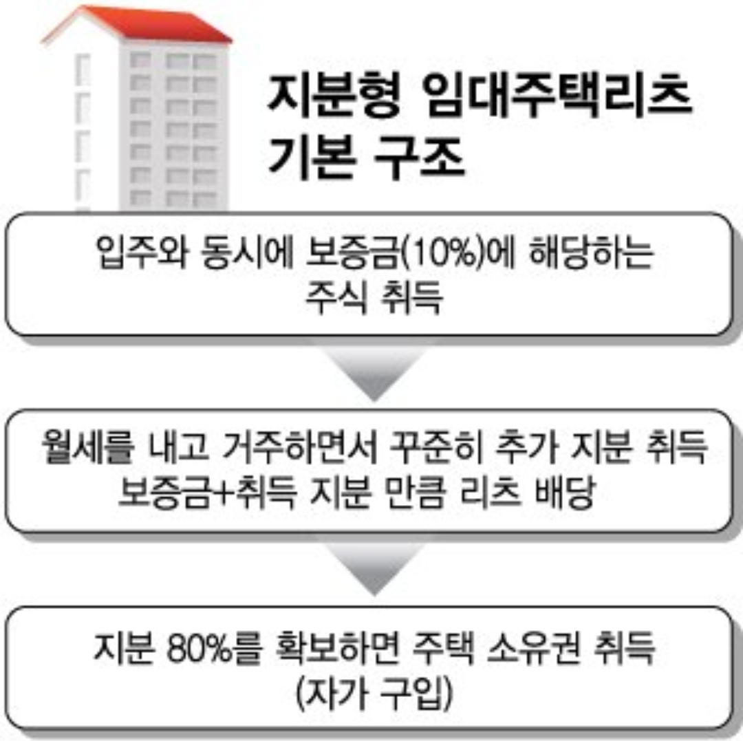 지분형 임대주택리츠의 기본구조는 입주자가 집값의 일부, 즉 약 10%에 해당하는 보증금만 부담하고, 10년 안에 리츠 주식 매입을 통해 거주하고 있는 주택 지분의 대부분, 가령 80%를 취득하면 소유권이 주어진다. 보증금은 리츠 주식으로 취득할 수 있어, 입주와 동시에 주택 지분 10%는 확보하는 셈이다. 입주 후에는 임차인으로서 거주하면서 월세(임대료)를 내고, 여윳돈이 생길 때 리츠 주식을 추가 매입하는 식으로 지분을 늘리면 된다.