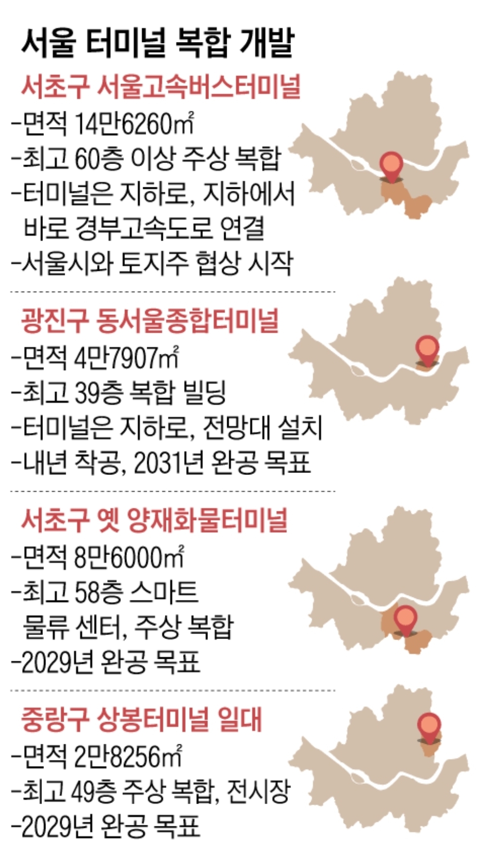 중랑구 상봉터미널 일대는 최고 49층 주상복합 단지로 바뀐다. 지역 주민이 이용할 수 있는 전시장 등을 함께 조성한다. 서초구 옛 양재화물터미널 자리는 하림이 최고 58층 첨단 물류센터로 개발 중이다. 두 곳 모두 2029년 완공을 목표로 한다.