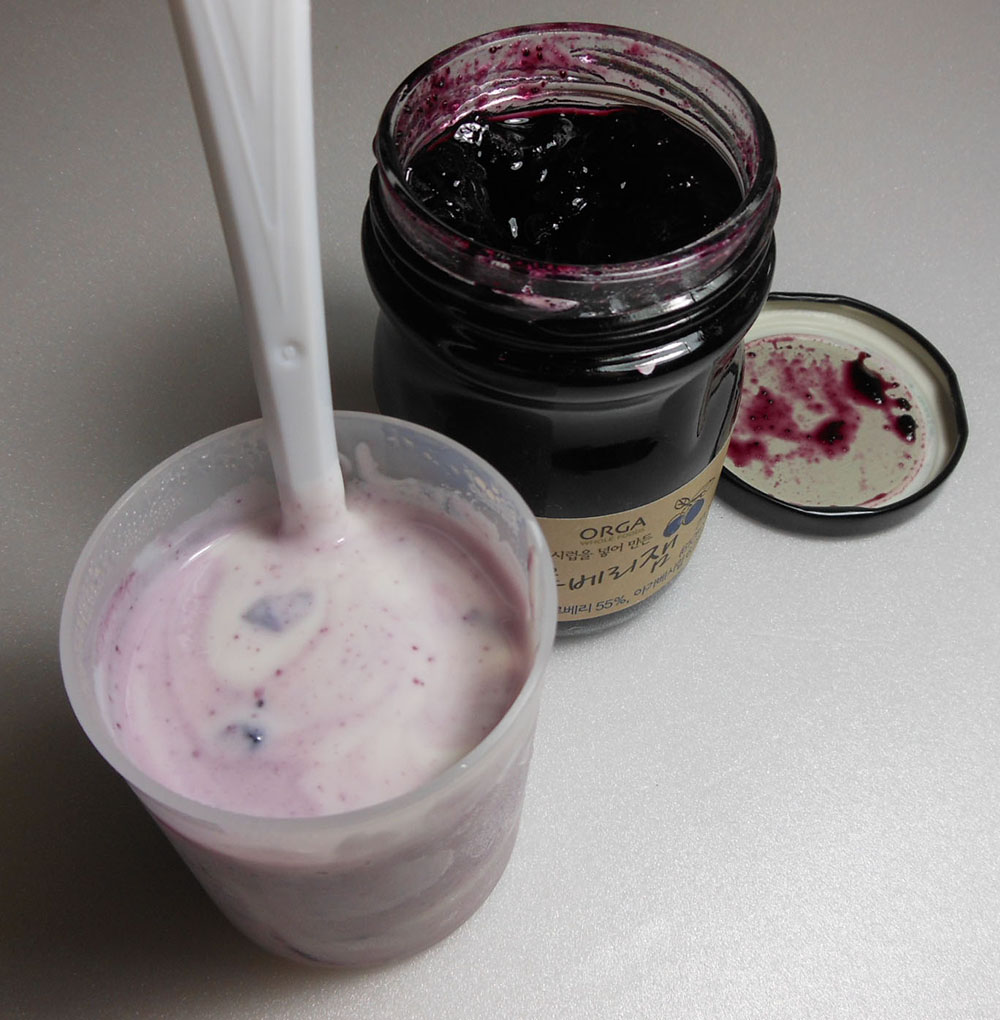 안그래도 요즘 요거트 만들어 먹으면서 심심해서 잼이라도 넣어 먹으면 좋겠다고 생각했는데, 여기에 블루베리 잼을 넣어먹으니 제법 맛있다.